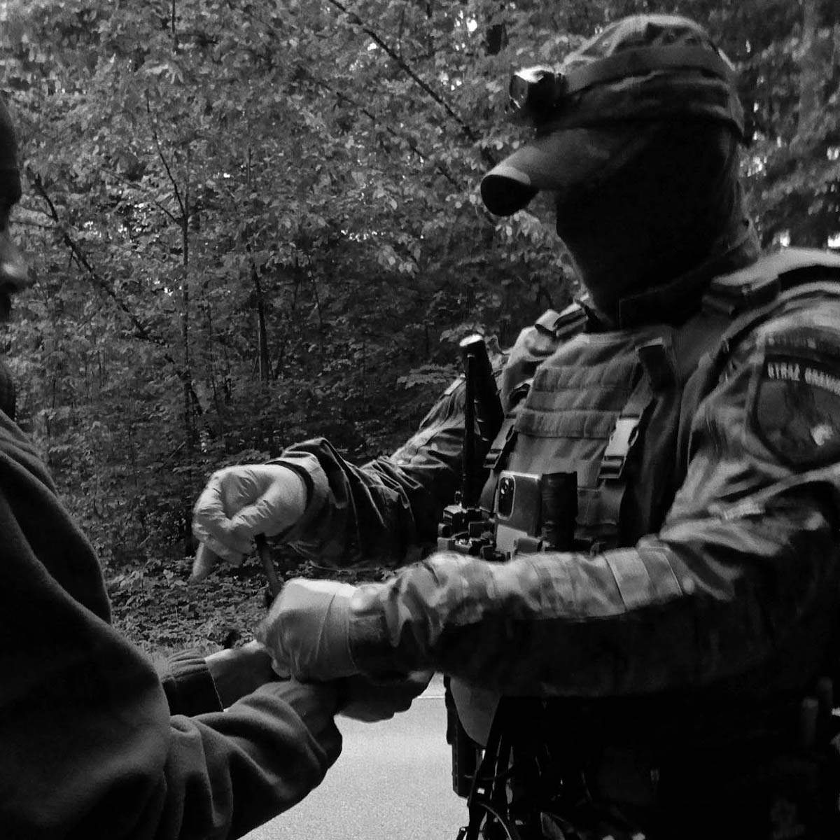 Un après-midi nous rencontrons en forêt deux personnes venues d’Érythrée et qui souhaitent demander l’asile en Pologne. Nous leur proposons à manger, les aidons à remplir les POA et nous sortons de la forêt pour attendre l’arrivée des SG au bord d’une route. Ces derniers mettront 12h à venir - cela fait partie de leur stratégie pour nous épuiser. Entre-temps, un 4x4 de l’armée passe devant nous. Les militaires nous aperçoivent avec des personnes racisées, pilent et sortent du véhicule. Tout dans leur attitude est fait pour générer du stress : ils descendent, enfilent leurs cagoules noires, cachent la plaque d’immatriculation avec du carton, viennent vers nous en faisant des gestes brusques et en nous criant dessus. Ils manipulent leurs armes en prenant soin de nous montrer qu’elles sont chargées. Une manière grossière de nous montrer qui est en position de force. Nous restons proches des personnes exilé.es qui sont terrifiées. Les militaires nous encerclent et nous gardent comme des Borders Collies. De temps en temps l’un d’entre eux patrouille quelques mètres en forêt, puis revient autour de nous en faisant tourner sa matraque en l’air. Un autre nous met en joue avec sa mitraillette. Ils sont agressifs et nous insultent en nous mettant le faisceau de leurs lampes puissantes en plein visage. Nous demandons aux camarades Polonais.es ce qu’ils disent. Ils nous reprochent d’aider les «migrants», car nous serions, par cet acte, des traîtres à la Pologne, des traîtres à l’occident. Ils nous expliquent en même temps qu’ils sont là pour nous protéger des exilé.es qui sont des personnes dangereuses - ces deux jeunes hommes à bout de force avec qui nous avons passé 12h en forêt…