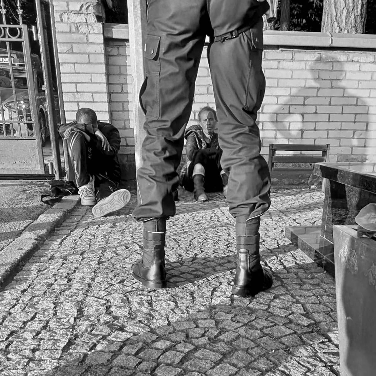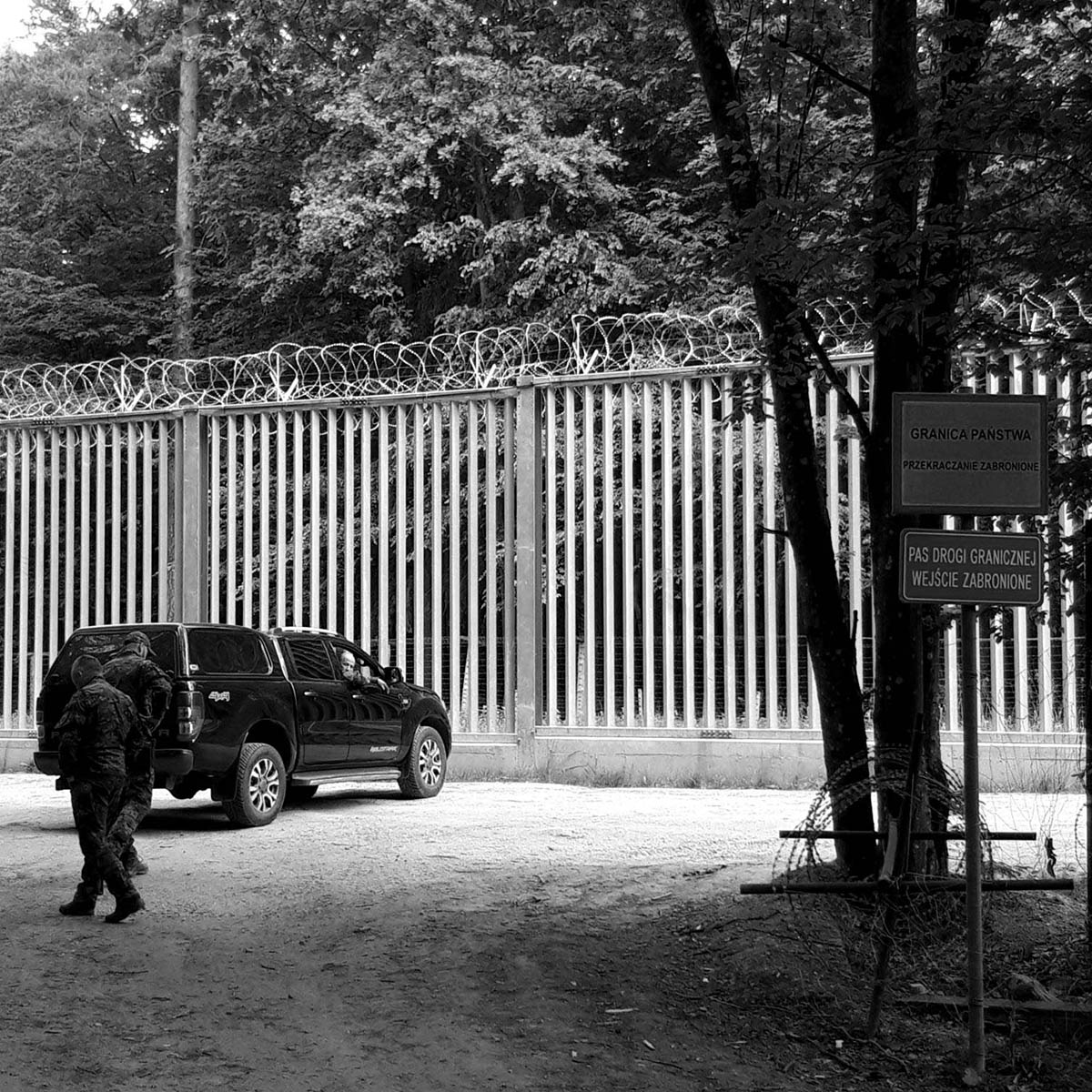 Nous nous mettons en route en direction du village. Une fois arrivés, nous restons en lisière de forêt pour ne pas attirer l’attention, car les habitant.es peuvent être inamicaux avec les personnes racisées. Un jeune garçon qui fait du vélo nous aperçoit et s’arrête. Il ne bouge pas, nous observe et nous fixe pendant une bonne demi-heure, comme s’il attendait lui aussi l’arrivée des militaires. Les SG arrivent. Treillis militaires, cagoules noires intégrales, gants, armes en bandoulière. Nous ne comprenons pas ce qu’ils disent au camarade polonais, mais les regards, les gestes et les intonations de voix ne sont pas équivoques et laissent transparaître une forte hostilité. Ils ordonnent aux exilé.es de se mettre en ligne, bras écartés. Ils les fouillent, prennent leurs documents et les font monter dans la cage-cellule à l’arrière de leur fourgon. Ils ferment à clé la porte faite de barreaux métalliques, claquent les portes arrière du véhicule et s’en vont. Nous ne les reverrons pas.