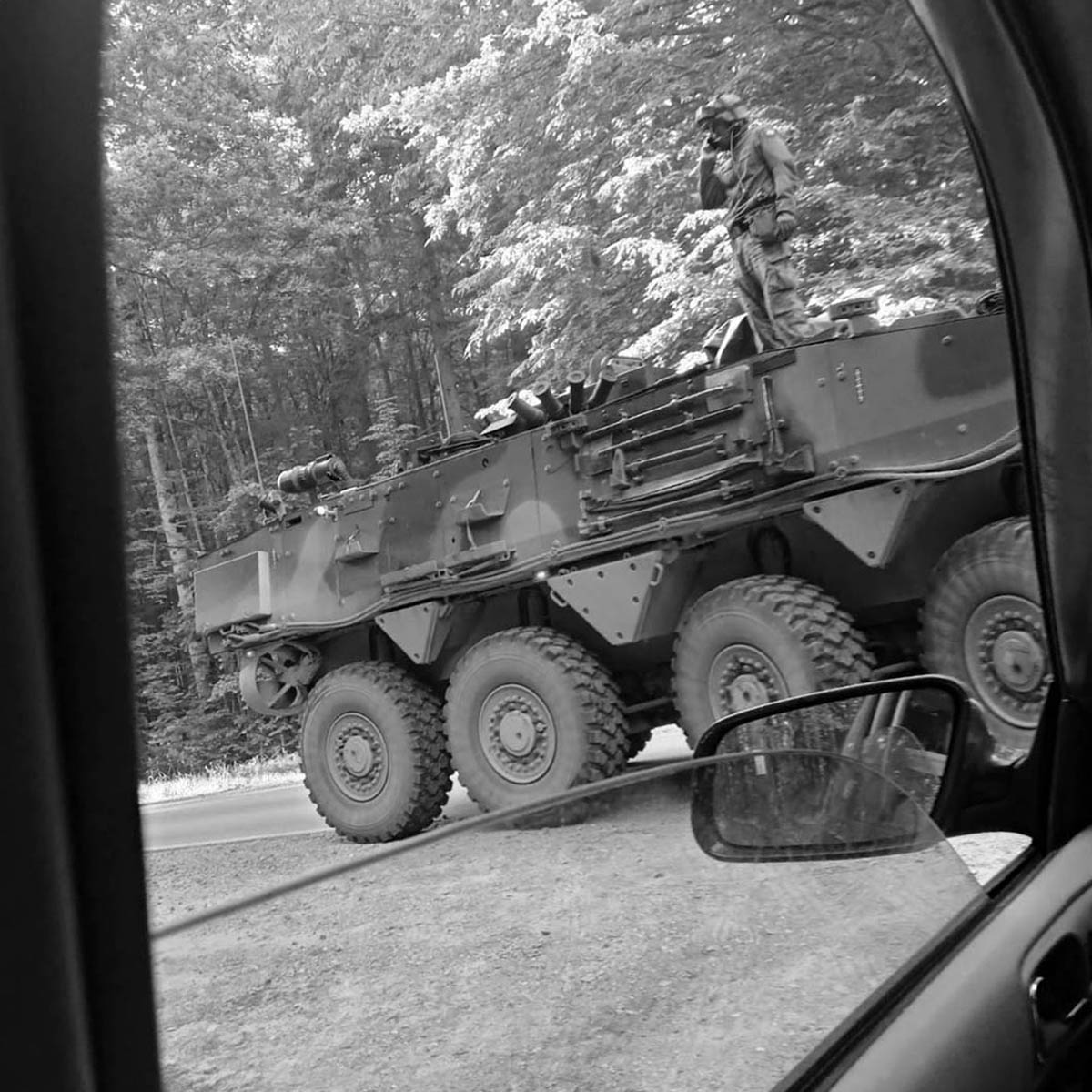 Nous ne nous étions pas attendu.es à voir une présence policière et militaire aussi importante. Le spectre de la guerre - ou du moins son spectacle, sa mise en scène - plane sur la ville d’Hajnówka et ses alentours. Nous nous faisons arrêter régulièrement lors des passages des nombreux check-points déployés autour de la ville : contrôle systématique des identités des personnes en voiture et ouverture des coffres. Nous croisons des véhicules militaires à chaque coin de rue et sur chaque route de campagne, des 4x4 hummer avec tourelles et des tanks, des camions bâchés remplis de soldats assis face à face en rang d’oignons, des camions radar cobra. Nous croisons les soldats partout: celleux en service patrouillent en ville ou en forêt; celleux en perm font des joggings au bord des routes, mangent des glaces sur les places de la ville ou font les courses dans les supermarchés. Il y a l’armée régulière polonaise dont font partie les gardes-frontières, mais aussi l’équivalent des réservistes. «Il faut faire attention avec eux» nous prévient K. un camarade polonais, «car ils sont jeunes, ont un flingue et du pouvoir. Ils viennent ici pour défendre la «Motherland», ils sont volontaires pour venir pendant leur week-end.»